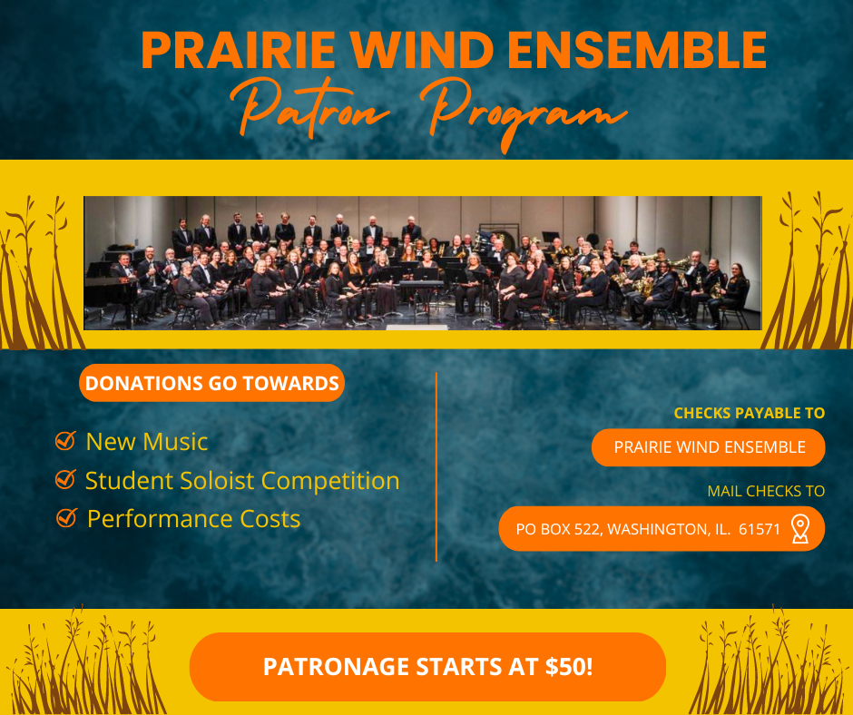 The Prairie Wind Ensemble’s Patron Program supports the group through donations that fund new music, a student soloist competition, and performance costs. Patronage starts at a donation of $50 and can be made by sending a check.
